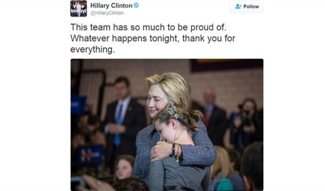 وكتبت هيلاري التي تخوض "حرباً" مفصلية الثلاثاء – الأربعاء: "أشعر بالفخر من فريقي، ومهما حصل اليوم أشكرهم على كل شيء".