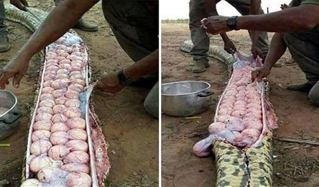 وبعد أن شقوا بطنها، استخرج القرويون بيض الأفعى، والتي يعتبرونها من أطايب الطعام النادرة. وعلى الرغم من أن من غير الواضح إلى أي نوع من الثعابين تنتمي هذه الأفعى، إلا أن غالبية الأفاعي تضع ما يقدر بحوالي 100 بيضة في كل حمل.