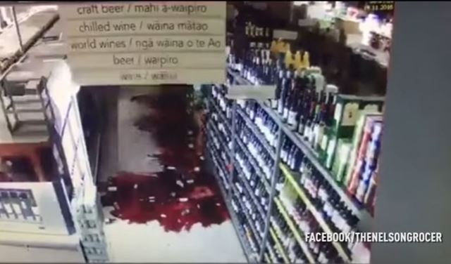 أظهر مقطع فيديو تنقالته العديد من مواقع التواصل الاجتماعي لحظة اهتزاز رفوف أحد المتاجر بعنف وتساقط زجاجات الشراب والعصير على الأرض أثناء الزلزال الذي ضرب نيوزلندا الليلة الماضية.