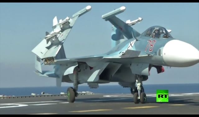 كما تظهر حاملة الطائرات "الأميرال كوزنيتسوف" التي انضمت للعمليات القتالية مؤخرا، إذ أقلعت مقاتلات "سو-33" من على متنها وضربت مواقع تابعة للإرهابيين.