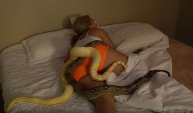 نفذ شاب مقلب مخيف في صديقته النائمة, فنشر فيديو وهو يضع الأفاعي على حبيبته وهي في الفراش .