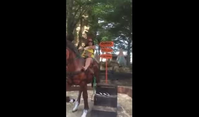 وأظهر مقطع الفيديو المتداول على موقع “فيسبوك”، الداودي خلال امتطائها مجسماً بشكل حصان، وتمثل أنها تسير به، وعند محاولتها النزول من على ظهره اختل توازنها وسقطت على الأرض.