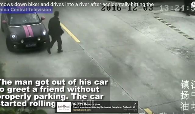 ولكن في الوقت الذي يكاد قد أدرك داخلها، كان سائق دراجة نارية قد عبر من ورائه لتركله السيارة من الخلف ويقع في مكانه، في حين تدحرجت السيارة وبداخلها الرجل في النهر.