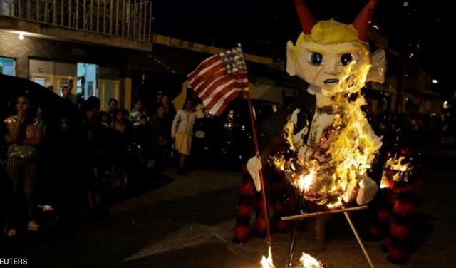 أضرم محتفلون في غواتيمالا النار في دمى من الورق المقوى، تمثل الرئيس الأميركي المنتخب دونالد ترامب وعلى رأسه قرنا شيطان، خلال احتفال تقليدي يقام كل عام قبل عيد الميلاد، يحمل اسم (لا كويما ديل ديابلو) أو حرق الشيطان.