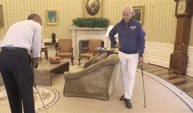 كانت مباراة قصيرة بالغولف بين الرئيس الأميركي باراك أوباما، في عقر داره بصالون البيت الأبيض البيضاوي، وبين مواطنه الممثل الكوميدي Bill Murray وصوروها في فيديو بثه البيت الرئاسي الشهير في موقعه الأحد الماضي، وفي اللعبة خرج أوباما مهزوما بتسديدتين خاطئتين مقابل صائبتين للمثل الذي دخلت كرتاه في كوب من الزجاج وضعوه أفقيا على سجاد الصالون بدل حفرة الغولف المعروفة.