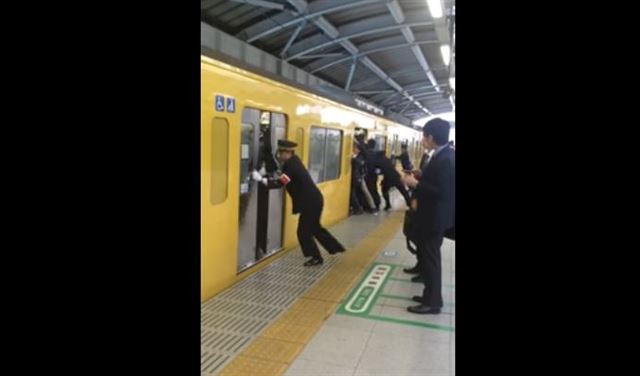 أظهر مقطع فيديو لمصور إيطالي في اليابان عمال محطة مترو طوكيو، وهم يجبرون الركاب على دخول القطار للسماح بالأبواب بالإغلاق.