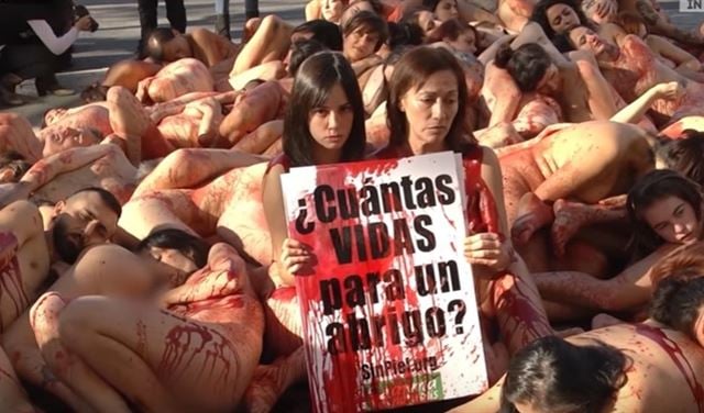 ارتمى المحتجون على الأرض فيما يشبه كومة من الجثث بلا حراك أو هتاف، ولطخوا أجسادهم بمادة تشبه الدماء، اعتراضا على قتل الحيوانات للحصول على فرائها.
