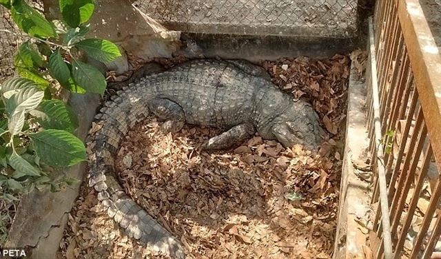 وتظهر التماسيح في المقطع، وهي تنتظر دورها في الإعدام، راقدة في حاويات ضيقة للغاية لا تتيح لها أي مساحة للحركة.