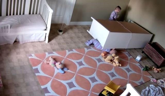لكن تبين، وفقا للفيديو الذي وثق الحادث، أن الطفل لم يصب بأذى، لكنه ظل محاصرا أسفل الخزانة وكان يبكي.