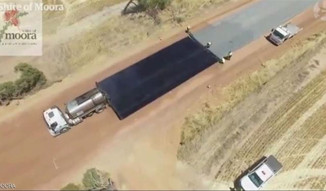 ويظهر المقطع السلاسة والسرعة في تعبيد طريق ببلدة مورا الأسترالية، حيث تمر الشاحنة الأولى لتبليط الطريق بالزفت، فيما تمر شاحنة ثانية لتغطية الطريق بالحصى.