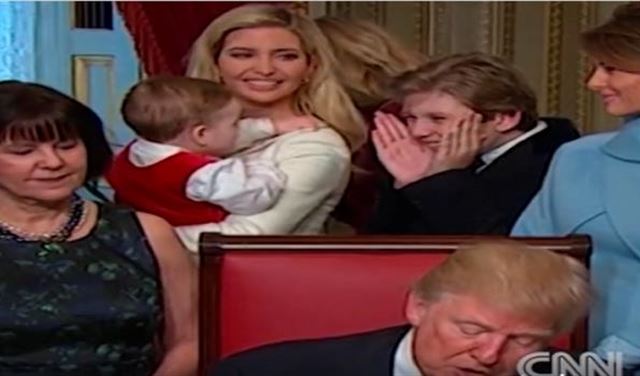 نشر موقع "CNN" على صفحته على "فيسبوك" مقطع فيديو خلال توقيع الرئيس الأميركي الجديد دونالد ترامب أول قرار له بشكل رسمي، حيث كان أفراد عائلته يقفون خلفه، ومن بينهم زوجته ميلانيا، وابنهما بارون، وابنته إيفانكا وهي تحمل طفلاً صغيراً.