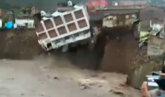 أظهرت صور تلفزيونية، نشرت حديثا، لقطات مذهلة لفندق قديم وهو ينهار بشكل كامل، ليسقط وسط نهر جارف، شرقي بيرو.