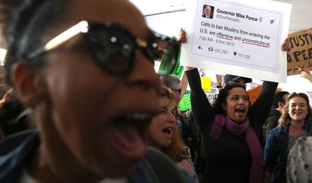 تجمع آلاف الأميركيين، الأحد، أمام البيت الأبيض بالعاصمة واشنطن، احتجاجا على قرار الرئيس دونالد ترامب، الذي يمنع مؤقتأ دخول اللاجئين ويحظر دخول مواطني 7 دول إلى الولايات المتحدة.