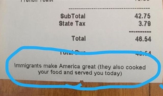 غير أن الرسالة التي قرر طبعها على فواتير المطعم قد تزيد شهرته: إذ يمكن قراءة عبارة "المهاجرون يصنعون عظمة أميركا (هم أيضاً من حضروا طبقكم وتولوا خدمتكم اليوم)"، في تحوير للشعار المعروف خلال حملة دونالد ترمب.