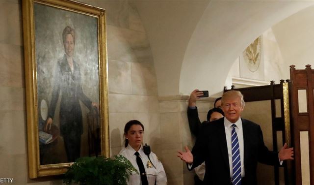 وفاجأ ترامب التلاميذ في قاعة مركز الطابق الأرضي تحت صورة كبيرة لكلينتون، وهي واحدة من مجموعة لوحات للسيدات الأول السابقات.
