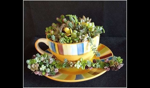تحول أكواب الشاي إلى أصص لحمل الأزهار الطبيعية، سواء كان ذلك من خلال وضعها في كوب واحد، أو تكديس عدة أكواب فوق بعضها البعض بشكل عمودي.