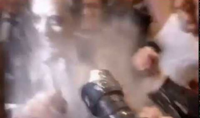 ويظهر مقطع فيديو كيف دخل فيون القاعة وهو يحيي مناصريه، ليقترب منه شاب ويرشقه بكيس الدقيق.