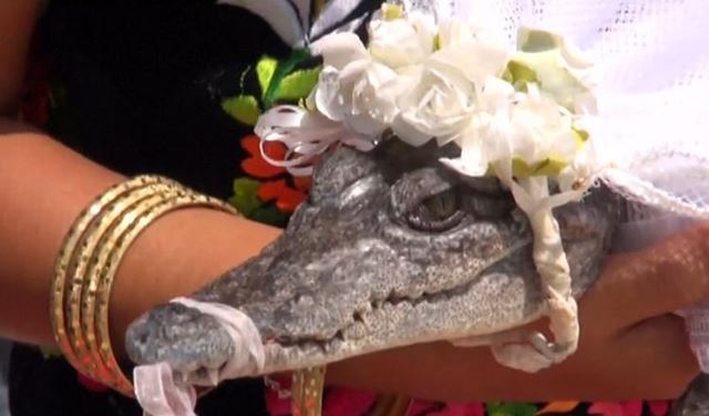 احتفلت بلدة مكسيكية بزفاف عمدتها من… تمساح! وحمل السكان التمساح في أرجاء البلدة. التمساح كان يرتدي ملابس تشبه فستان الزفاف. ورقص العمدة مع "أميرته" قبل أن يشارك أهل البلدة جميعهم بالرقص.