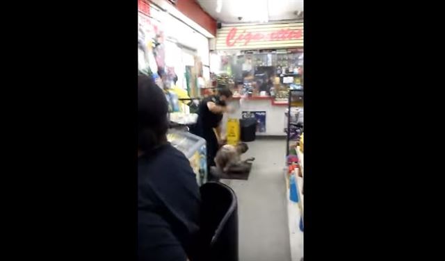 وقال الشرطي انه اضطر لاستخدام عصاه لإجبارها على الخروج بينما تظهر المقاطع التي صورها "ستايسي زاشيري" بهاتفه المحمول، الشرطي وهو ينهال عليها بالضرب دون أمرها بالخروج من المتجر، بحسب "يورو نيوز".