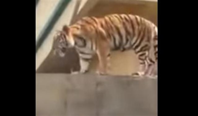 ويظهر مقطع الفيديو، وقوف النمر على حافة سور منزل ينظر بترقب إلى أحد الماشية الموضوعة بعربة نقل لينقض عليها في الوقت المناسب.