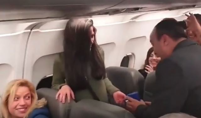 "سيداتي وسادتي اهلا وسهلا بكم، لست قبطانا ولا من افراد طاقم الطائرة، ولم آت لاخبركم عن الاحوال الجوية في قبرص، ولا اننا سنصل لارنكا بعد قليل، انما انا هنا لطرح سؤال على احدى الراكبات وهو: "رنا هل تتزوجينني؟".