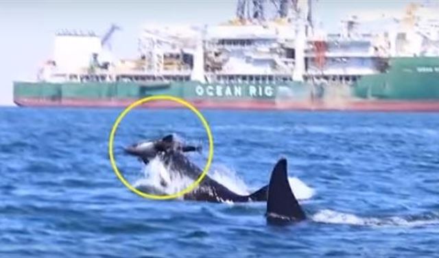 نشر فريق من الباحثين مقطع فيديو لحوتين قاتلين، انقض أحدهما على دلفين قبالة ساحل ناميبيا.