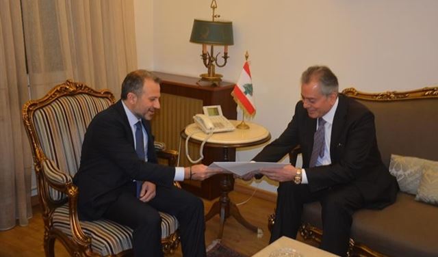 التقى وزير الخارجية والمغتربين في حكومة تصريف الأعمال جبران باسيل السفير السوري علي عبد الكريم علي الذي سلّمه ردّ وزير الخارجية السوري وليد المعلم على القانون رقم 10.