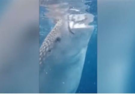 وتظهر مشاهد الفيديو، الذي صوره فريق الغطس، بمشاركة يوهانسن، تدفق المياه بكميات كبيرة عبر فم سمكة قرش الحوت، وكأنها دوامة من المياه تبتلع كل ما حولها.