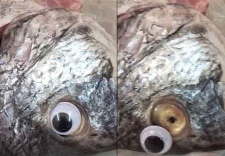 وأظهرت إحدى الصور المنشورة على موقع تويتر أن العيون الزائفة انزلقت من وجه السمكة، لتكشف بوضوح عن عيون صفراء أسفلها، مما يشير إلى عدم جودة الأسماك.