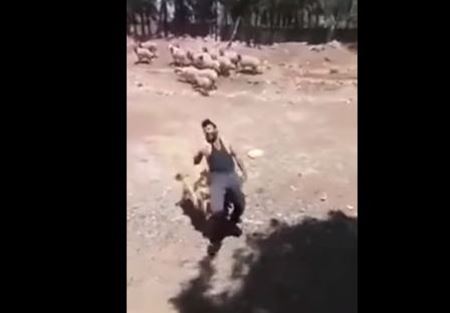 وقطع الراعي عدة أمتار وهو على ظهر الخروف، وبعدها ترجل متوجها نحو صديقه، ولكن الخروف الغاضب لم يعجبه الموقف، وركض نحوه ونطحه بقرنيه الكبيران، مما أدى إلى سقوطه أرضا.