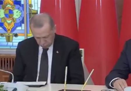 التقطت عدسات الكاميرا، الرئيس التركي رجب طيب أردوغان وهو يستسلم للنوم أثناء مؤتمر صحفي مع نظيره المولدوفي أيغور دوندون.