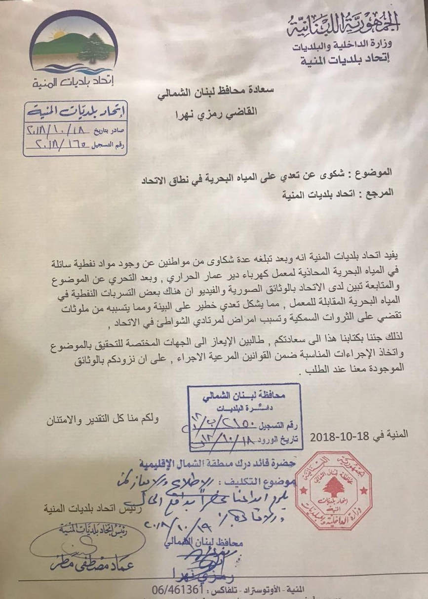 وأوضح في كتابه انه بعد تبلغه "عدة شكاوى من مواطنين عن وجود مواد نفطية سائلة في المياه البحرية المحاذية لمعمل كهرباء دير عمار الحراري، وبعد التحري عن الموضوع والمتابعة، تبين لدى الاتحاد بالوثائق الصورية والفيديو، ان هناك بعض التسربات النفطية في المياه البحرية المقابلة للمعمل، مما يشكل تعديا خطيرا على البيئة، ويتسبب بملوثات تقضي على الثروات السمكية وبأمراض لمرتادي الشواطىء في المنطقة".