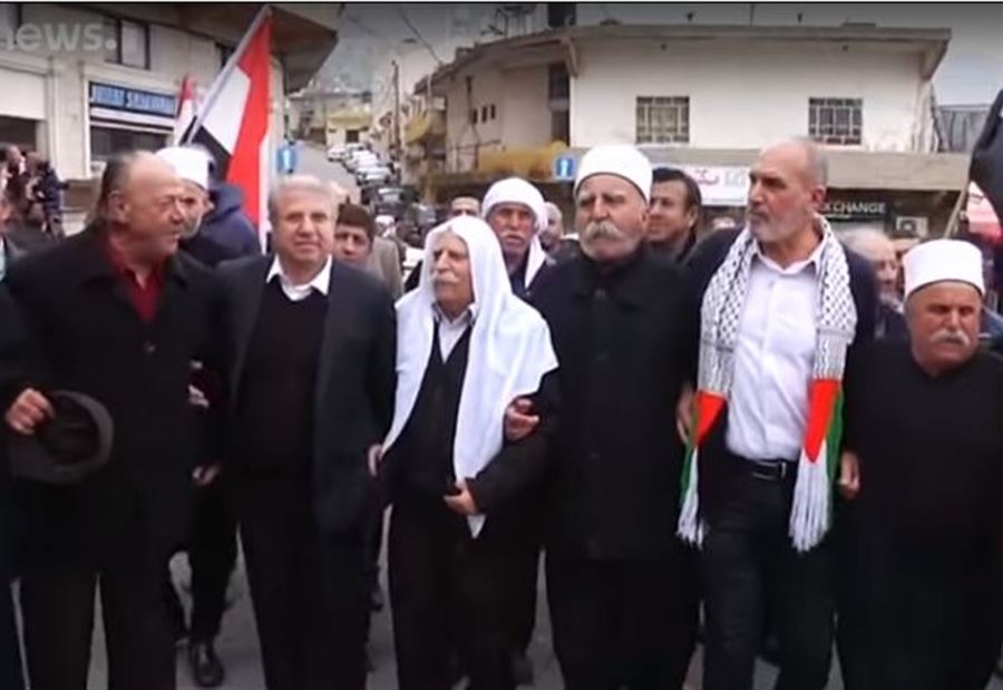 تجمع عشرات من الدروز العرب الذين كانوا يحملون العلم السوري وصور الرئيس بشار الأسد في مرتفعات الجولان يوم السبت احتجاجا على دعم الرئيس الأميركي دونالد ترمب لسيادة إسرائيل على المنطقة.