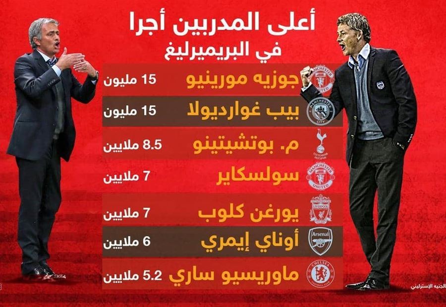 أما أعلى المدربين أجرا في "بريميرليغ"، فهم إلى جانب مورينيو (سابقا) الإسباني بيب غوارديولا، مدرب مانشستر سيتي، ويقدر راتبه بحوالي 15 مليون جنيه إسترليني (20 مليون دولار)، يليه مدرب فريق توتنهام هوتسبر، الأرجنتيني ماوريسيو بوتشيتينو الذي يصل راتبه إلى 8.5 مليون جنيه (11 مليون دولار)