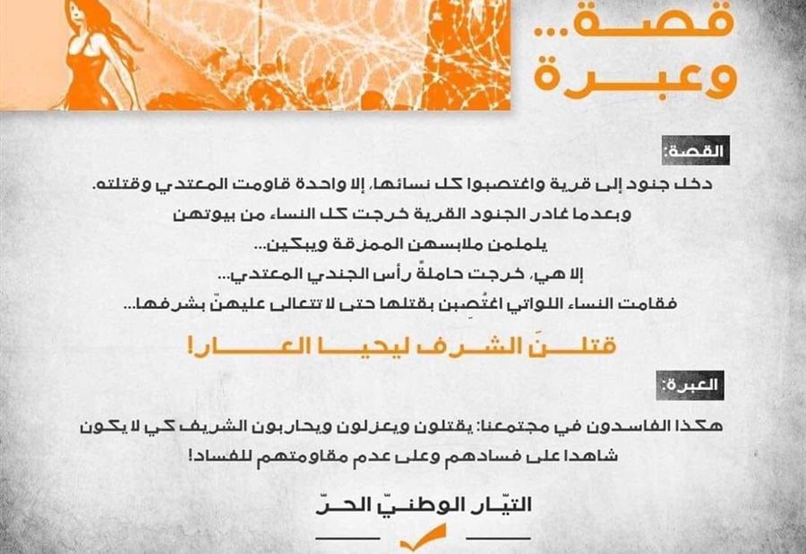 أفادت اللجنة المركزية للإعلام في "التيار الوطني الحر"، أنه "بتاريخ 5 نيسان 2019 وزعت اللجنة المركزية للاعلام عبر مواقع التواصل منشورا تحت عنوان "قصة وعبرة"، خلاصته اجراء مقارنة رمزية بين واقعنا السياسي وحقيقة تاريخية مفادها ان ليس الجميع يناضل ضد الظلم، وان المستسلمين غالبا ما ينقضون على من وقف الى جانب الحق، وهو ما يتعرض له التيار بشكل يومي، ولاسيما بموضوع مكافحة الفساد".