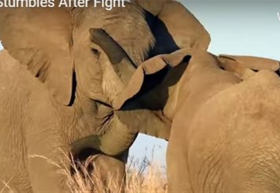 وتظهر مشاهد الفيديو تشابكا بين فيلين صغيرين انتهت بتعثر الفيل الخاسر أثناء مغادرته ساحة القتال باتجاه القطيع.