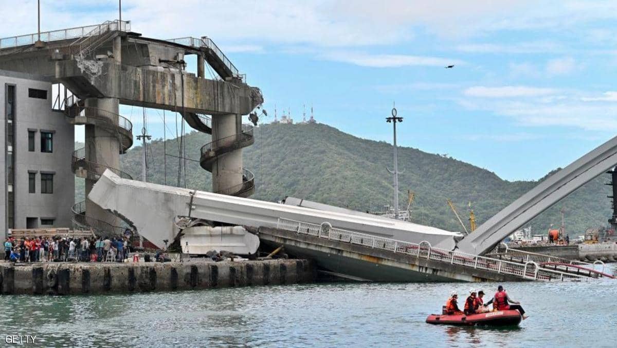 انهار جسر معلق شاهق فوق خليج شرقي تايوان، الثلاثاء، مما أدى إلى سقوط شاحنة بها صهريج نفط فوق قوارب.