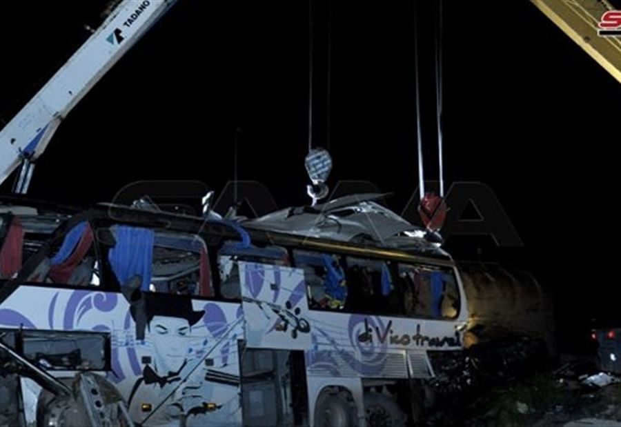 مقتل نحو 30 شخصاً وإصابة العشرات إثر إصطدام صهريج وقود بحافلتين نقل ركاب قرب جسر بغداد علىّ اوتستراد حمص دمشق . pic.twitter.com/bfYG3CYZWa