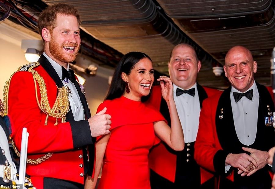وتمَّ استقبالها وهاري من قبل 5 من أعضاء مشاة البحرية، قبل اصطحابهما إلى القاعة الملكية للاستمتاع بليلة من الترفيه الموسيقي لجمعية المارينز الملكية The Royal Marines Charity.