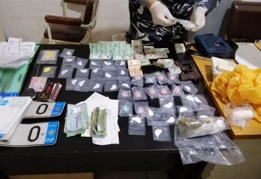 ضُبط في داخل سيّارة المشتبه بهما بترويج المخدرات /49/ ظرفاً من مادتي الكوكايين وباز كوكايين معدّة للترويج، إضافةً إلى كمية من حشيشة الكيف والماريجوانا، مسدس حربي عيار /9/ ملم. دفتر ورق لف سجائر، ومبلغ /2217000/ ل. ل. و /195/ دولاراً أميركياً، و/3/ لوحات سيّارات اثنتان منهما خصوصية وثالثة مخصصة لتأجير السيارات.