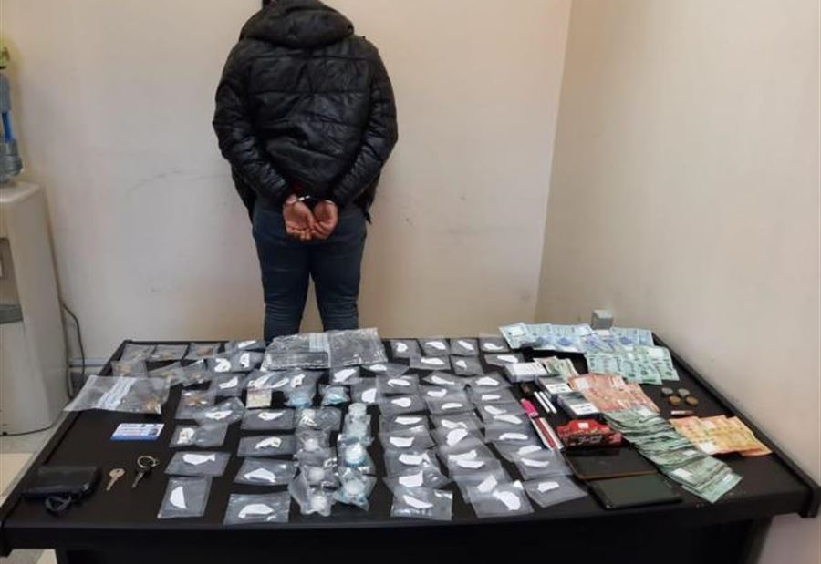 ووفق البيان، "ضُبِط بحوزته كميّة من المخدّرات المعدّة للتّرويج، على الشّكل التّالي: "/37/ مظروفًا بداخله مادة باز الكوكايين زِنتها /78/غ، /10/ علب بلاستيكية و/12/ ظرفاً بداخلها مادة الكوكايين، زِنتها /93/ غ، /8/ أكياس بداخلها مادّة حشيشة الكيف، زِنتها /44/غ، /6/ غرامات من مادّة "كريستال ميث، /31/ حبة "كبتاغون".