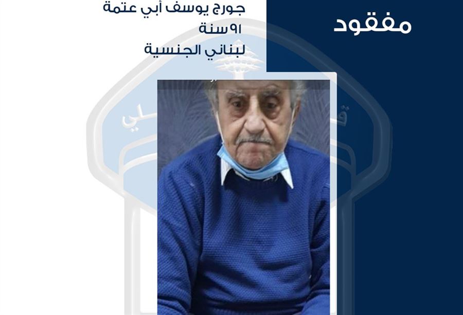 عمّمت المديرية العامة لقــوى الامــن الـداخلي ـ شعبة العـلاقـات العـامـة، بناءً على إشارة القضاء المختص، صورة المفقود "جورج يوسف أبي عتمة (من مواليد عام 1930، لبناني) الّذي غادر بتاريخ 27-6-2021، مؤسّسة لرعاية المسنين في بلدة بحرصاف– المتن، إلى جهةٍ مجهولة، ولم يَعُد لغاية تاريخه".