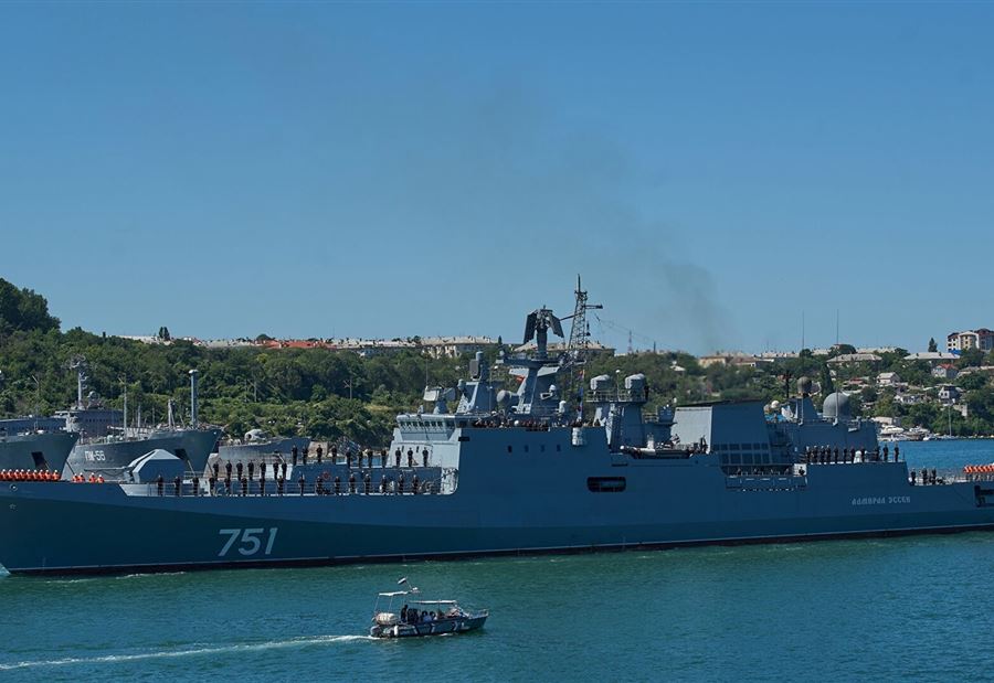 ويراقب الأفراد العسكريون في أسطول البحر الأسود الروسي توجهات السفينة الأجنبية.