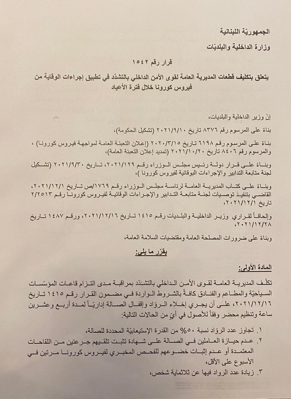 إليكم قرار وزير الداخلية والبلديات القاضي بسام مولوي الذي يقضي بتكليف قطعات المديرية العامة لقوى الأمن الداخلي بالتشدّد في تطبيق إجراءات الوقاية من فيروس كورونا خلال فترة الأعياد، وبإقفال المؤسسات المخالفة وإخلاء روادها.