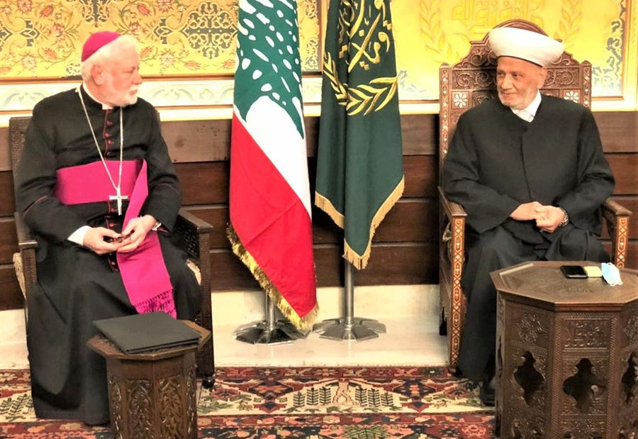 استقبل مفتي الجمهورية اللبنانية الشيخ عبد اللطيف دريان, في دار الفتوى, اليوم الخميس, وزير خارجية دولة الفاتيكان المطران بول ريتشارد غالاغير على رأس وفد، في حضور الأمين العام للجنة الوطنية للحوار الإسلامي المسيحي الدكتور محمد السماك.