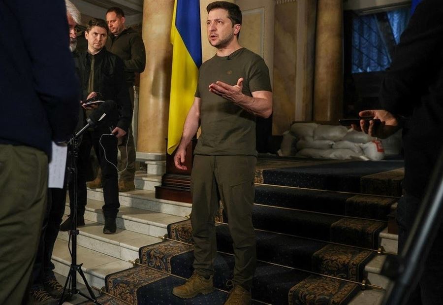 زيلينسكي، ورغم ظروف الحرب قبل بإجراء مقابلة صحافية سريعة والحديث عن يومياته خلال الحرب، وكذلك تأكيد وجوده وفريقه الرئاسي في كييف.