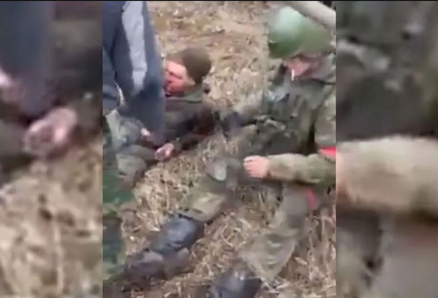 ويظهر في الفيديو أسيران من القوات الروسية، وحولهما عدد من الجنود الأوكرانيين ومواطنين.