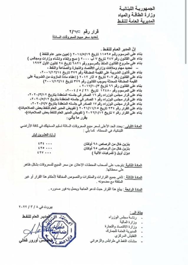 بنزين خال من الرصاص 98 أوكتان بـ434000 ل.ل.