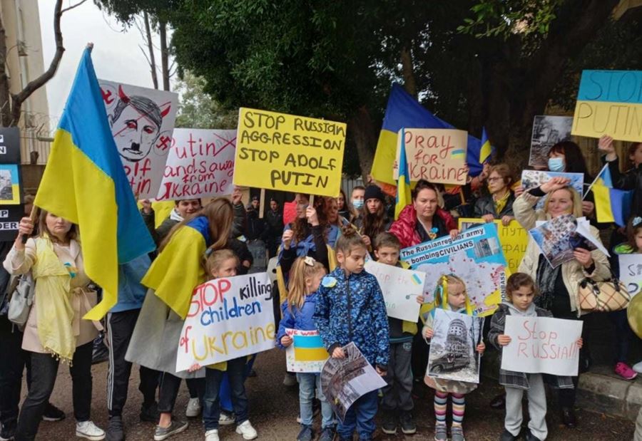 تظاهر العشرات من الجالية الأوكرانية في لبنان أمام السفارة الروسية في بيروت، تنديدا بالغزو الروسي.
