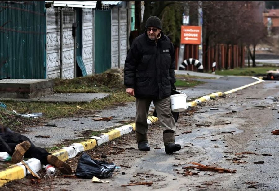 ويظهر مقطع فيديو آخر تم التقاطه في شارع يابلونسكا ثلاث جثث أخرى. أحدهما يقع بجانب دراجة، وآخر بالقرب من سيارة مهجورة.